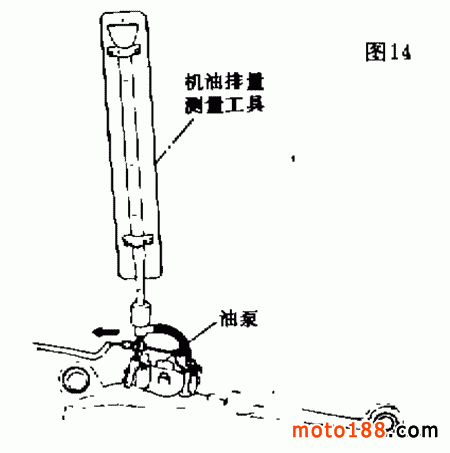 在機油排量測量工具(鈴木車專用工具 09900—21602 )中裝滿鈴木 CCI 潤滑油,然后將其連接于泵的真空面,如圖14。啟動發(fā)動機,使發(fā)動機的轉(zhuǎn)速保持在 2000r/min ,工作 6min 。這時,量具上的讀數(shù), FZ50 型摩托車應(yīng)在 1.02 ~ 1.26mL 范圍內(nèi); TR125 型摩托車應(yīng)在 4.2 ~ 5.1mL 范圍內(nèi)。