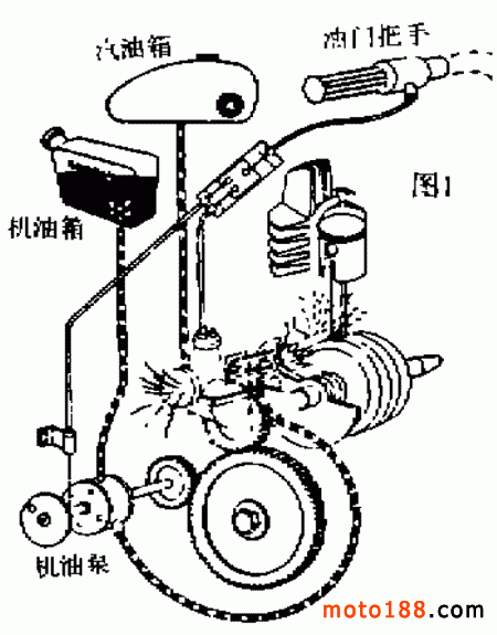 分離潤滑是用單獨的機油箱儲存潤滑油,并根據(jù)發(fā)動機負荷的不同,通過輸油管、機油泵等供給不同量的潤滑油。發(fā)動機的負荷小,供給的潤滑油量也小;發(fā)動機的負荷大,供給的潤滑油量也大。這種潤滑方式,彌補了混合潤滑的不足。根據(jù)供油方式的不同,分離潤滑又可分為兩種。一種是通過機油泵、輸油管將適量的潤滑油輸送到化油器中,與汽油混合后形成可燃混合氣,進入曲軸箱和汽缸內(nèi)完成潤滑任務(wù),如圖1 所示。由于這種潤滑方式不能有目的地將潤滑油輸送到各個需要潤滑的部位,因而潤滑油的利用率仍然不高。雅馬哈 V50 、 MA50 、 V80 、 DX100 、 RX125 型摩托車均采用這種潤滑方式。