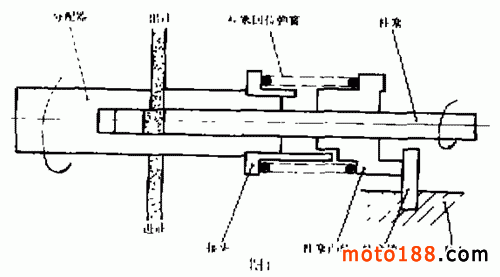 機油泵也有兩種結(jié)構(gòu)型式。一種是上述第一種分離潤滑方式采用的型式,其結(jié)構(gòu)如圖 3所示。這種機油泵的工作原理是:柱塞銷在柱塞彈簧的作用下,始終緊靠在分配器的凸輪斜面上。當發(fā)動機工作時,蝸輪及分配器旋轉(zhuǎn),同時推動柱塞左、右動作。當柱塞移到最右邊時,分配器的油孔恰好對準進油孔,潤滑油便被吸入;當柱塞向左移動,分配器的油孔對準出油孔時,潤滑油便被排出。調(diào)整擋板隨柱塞由最右邊向左移動,到接觸控制凸輪的端面時止,所移過的距離叫柱塞行程。控制凸輪在控制凸輪彈簧的作用下,其斜面始終保持與螺釘接觸。當轉(zhuǎn)動油門轉(zhuǎn)把時,油門鋼索與機油泵鋼索連動,控制凸輪在機油泵鋼索的操縱下,轉(zhuǎn)動的同時又向左移動,柱塞行程便加大。當油門轉(zhuǎn)把及控制凸輪處在自由位置,且柱塞移到最右邊時,調(diào)整擋板與控制凸輪端面的距離稱為最小柱塞行程。車型不同,最小柱塞行程的規(guī)定值也不同。通過調(diào)整墊片的厚度,可以調(diào)整最小柱塞行程的大小。