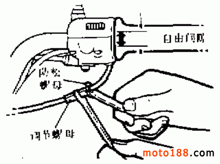 ( 1 )油門鋼索自由間隙的調(diào)整如圖5所示,松開防松螺母,調(diào)整調(diào)節(jié)螺母,使油門轉(zhuǎn)把的自由間隙達到 5 ~ 8mm ,然后緊固防松螺母。
