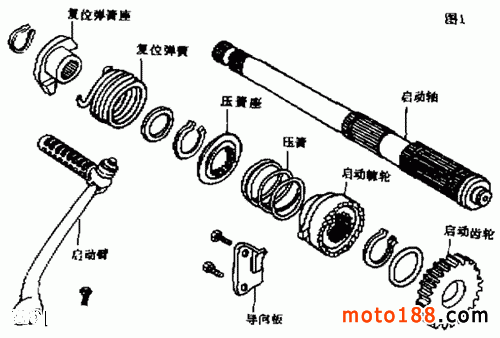 啟動(dòng)時(shí),踩下啟動(dòng)臂,啟動(dòng)軸轉(zhuǎn)動(dòng),啟動(dòng)軸上的啟動(dòng)棘輪也隨之轉(zhuǎn)動(dòng);啟動(dòng)棘輪外圓上的凸塊脫離導(dǎo)向板限制,棘輪被壓簧推向啟動(dòng)齒輪,并與啟動(dòng)齒輪側(cè)面的棘齒嚙合,使啟動(dòng)齒輪同步轉(zhuǎn)動(dòng);然后通過副軸和主軸上的一擋齒輪及處于結(jié)合狀態(tài)的離合器,將動(dòng)力傳遞到發(fā)動(dòng)機(jī)曲軸上,并最終啟動(dòng)發(fā)動(dòng)機(jī)。啟動(dòng)后,駕駛者迅速放松啟動(dòng)臂,在復(fù)位彈簧作用下,啟動(dòng)軸反轉(zhuǎn),啟動(dòng)棘輪上的凸塊沿著導(dǎo)向板的斜面上移,使棘輪與啟動(dòng)齒輪脫開嚙合。這樣,啟動(dòng)齒輪只是在啟動(dòng)軸上空轉(zhuǎn),而不帶動(dòng)啟動(dòng)軸。如啟動(dòng)后未及時(shí)松開啟動(dòng)臂,則啟動(dòng)齒輪與啟動(dòng)棘輪的棘齒之間處于打滑狀態(tài),以防損壞啟動(dòng)機(jī)構(gòu)。