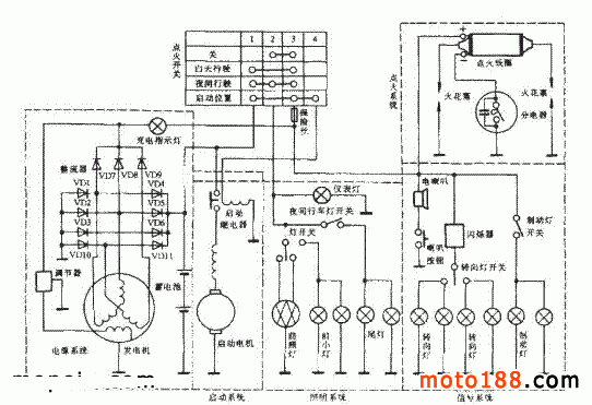 長江750F 型正三輪摩托車的長江750F1 型發動機電路的工作原理如圖所示。整個電氣系統可分為點火系統、電源系統、啟動系統、照明系統和信號系統。