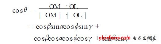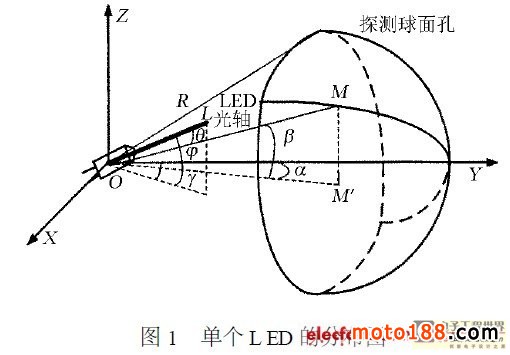 則L ED 光軸對應的單位坐標為(co sφsinγ,cosφsinγ,sinφ) ,探測球面上M點的坐標( rcosβsinα,rcosβcosα, rsinβ) 。
