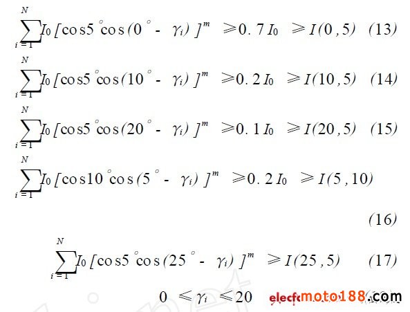 將對應(yīng)的國標(biāo)規(guī)定的各測點的光強值代入公式(10) 到公式(18) ,通過MA TLAB 求解出方程組的滿意解,即采用3 ×5 的排布,γi 為(0 , ±5°, ±10°) ,即每行5 個L ED 采用柱面型排布。