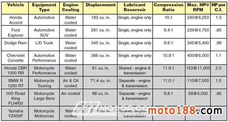 接下來就是引擎的容積效率,把引擎輸出馬力除以輸出引擎排量(此圖為美式單位~立方容積),可以看出摩托車引擎容積效率遠遠大于汽車,幾乎是汽車的兩倍,也代表著機油需要承受更高的溫度與壓力,所以一般汽車機油完全無法用于摩托車。