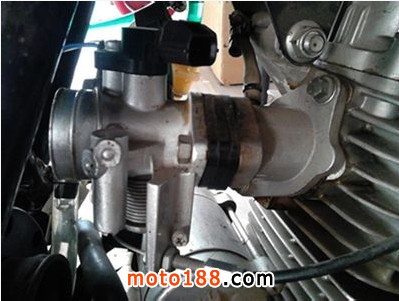 首先把化油器取下來,把噴油器先裝到進氣門閥體上,否則后面不好裝了,然后把節氣門閥體連接到原車的進氣歧管上,進氣歧管上有個小管,各位自己想辦法堵一下吧,而閥體的進氣端連接到原空氣濾清器上,就像圖里這樣。
