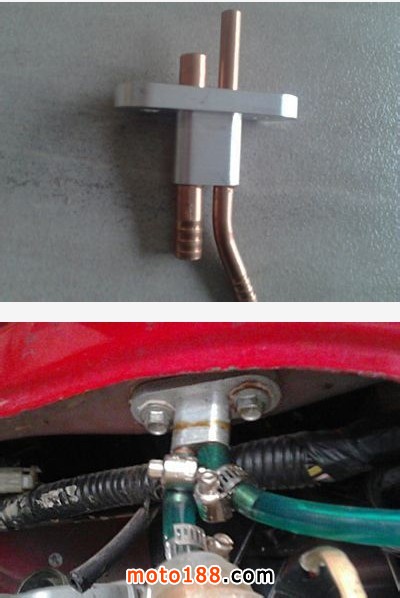 接下來是油箱的改裝,這是比較麻煩的,但是必須要改的,需要安裝燃油泵,因為要保證燃油的油壓,還得將多余的油通過回油管返回給油箱,而我把原來的油箱開關拆了下來,然后換上了廠家提供的替代油箱接口(見下圖),一個口進油一個口出油。(沒有我這種油箱開關的就需要自己在油箱上打個孔裝回油管,例如踏板車)