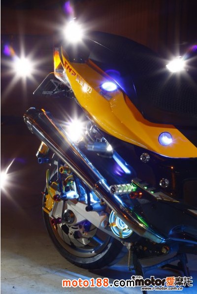 Tuner將此臺G-Max植入全套Car Audio器材,不但在騎乘時自己可以聆聽的過癮,旁人也能一并享受,讓聽覺有無比震撼的節奏感,并透過燈光改在喇叭頭加裝CCFL冷陰極管,搭配震波接收器,即使是在暗黑深處,也能發出爆閃冷光,絕對可令人轉頭觀看,得到多方的感官刺激:重低音效果更是必備,由腹內的射出音壓沒有方向性限制,可是擁有轟炸街頭的實力,并由車體后方可直接看到外蓋造型獨特的毒蜘蛛低音炮!連同首見的Ohlins雙后連桿阻尼棒,也是為了兼顧音響改裝的制震裝置,讓車輛震動產生的雜音與敲擊情況降到最低,更可環顧車輛改裝品與行車穩定性。