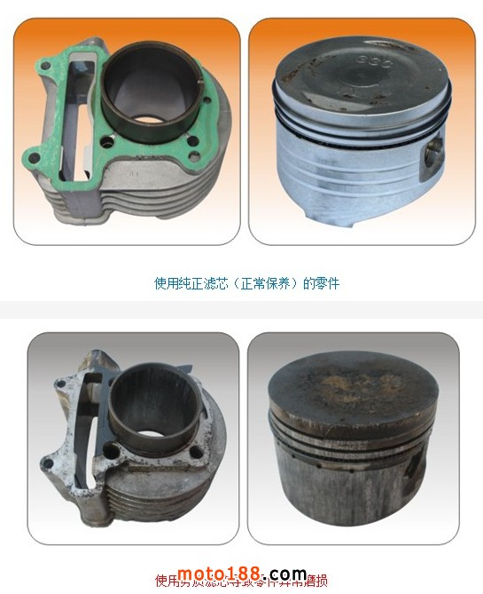 1.劣質空氣濾芯器一方面濾紙材質粗糙,過濾性能差,不能有效阻止空氣中的灰塵進入燃燒室;另一方面其外形尺寸與安裝殼體之間容易出現空隙,導致部分空氣未經過濾就進入燃燒室。灰塵進入燃燒室,導致氣缸體、活塞、活塞環等發動機零件異常磨損,從而導致發動機出現燒機油現象。