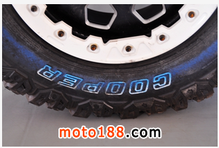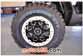 一雙合適的高性能的鞋,不僅能夠令速度提高,也能起到穩(wěn)固的作用。輪轂改裝為防脫圈輪轂,造型比較溫潤(rùn),如果是沙漠行駛的話(huà)會(huì)改變胎壓,極易出現(xiàn)脫圈的情況,改裝了防脫圈就像系緊了鞋帶,不會(huì)讓你在沖刺的時(shí)候被鞋帶散開(kāi)所牽絆。更換了固鉑DISCOVERER STT輪胎(Super Traction Tread,超級(jí)牽引輪胎),采用Armor-Tech3技術(shù)的結(jié)構(gòu)令輪胎異常堅(jiān)固,能夠從容應(yīng)對(duì)戈壁路況下外界異物的強(qiáng)烈沖擊。
