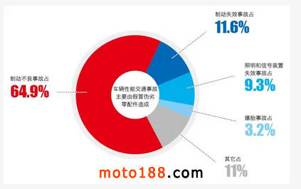 據交警部門統計,車輛性能交通事故主要由于使用假冒偽劣零配件造成,其中制動不良事故占64.9%、制動失效事故占11.6%、照明和信號裝置失效事故占9.3%、爆胎事故占3.2%。