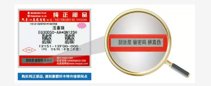 豪爵純正部品是唯一確保豪爵鈴木摩托車整車完美性能的專業部品。豪爵純正部品均采用電碼防偽技術,機油標貼和配件標簽上均有一個16位或17位的防偽識別碼,且具有唯一性,不易破譯。用戶購買后,可刮開防偽涂層,按以下四種方式輸入密碼查詢真偽。