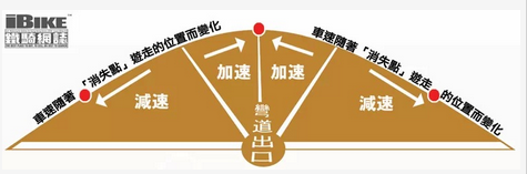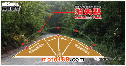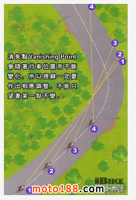 當「消失點」開始偏離中間點,游向視野兩旁時,表示人車開始接近彎道?!赶c」越向旁邊移動,代表彎道越急。當「消失點」移向中間時,代表接近彎道出口,在應付連續的陌生彎道時,我們只要依隨著以下的原則,對應著「消失點」的變化便可提升攻彎的流暢度: