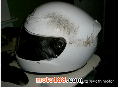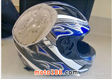這張圖片應該大家都有印象吧,這是在以時速70mph,約112km/h發生事故,頭盔在地上滑行的慘狀。如果用劣質的安全帽,其實跟沒帶是一樣的效果。