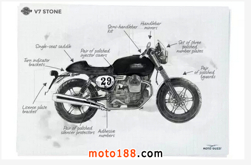 Dapper風格用在在V7的三款車上都能游刃有余,而Racer車型由于先天的咖啡范兒,省去了油箱、坐墊和手把的更換,使Dapper風格駕馭起來更加方便。但是假設一個紳士騎著Racer改裝的Dapper在路上遇見一位心儀的姑娘,要載她去目的地的話,加裝一對后腳踏是有必要的,而Stone和Special在這一點上就顯得自如了許多。