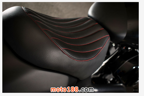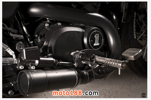 在原裝座椅上安裝了一個(gè)定制坐墊,重置了點(diǎn)火鎖和喇叭使外觀看起來更加簡潔一體。在廉價(jià)摩托車上會看到的線束也被部分隱藏。中控噴上黑漆并打孔裝上了哈雷的“Silencer”腳踏。