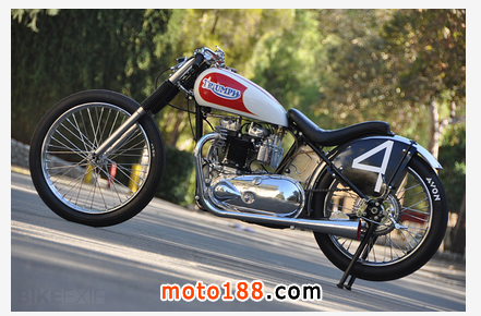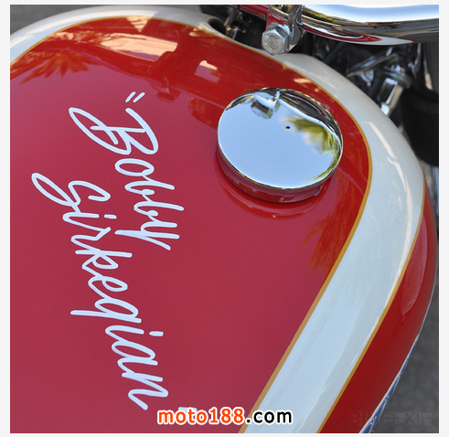 這臺1951年出廠的凱旋雷鳥被Sirkegian翻修一新,但完全保留了當年的原貌。當初為了適應南加州賽車協會SCTA的要求,整車的動力系統都被加以強化,發動機在拓缸后換上了特制的040大尺寸曲軸連桿和小號的正時齒輪,改裝的缸頭為發動機增加了進氣和排氣量。這臺雷鳥當時參加的是650cc組別的直線競速,如今我們開來倒是臺很拉風的美式Bobber,尤其是將排氣管里面漆成紅色,真是悶騷到了極點。這不最近時裝設計師 Christian Louboutin 就正在和圣羅蘭YSL因紅色高跟鞋底的設計專利打著如火如荼的官司,看來全世界的男人真的都很喜歡這種驚鴻一瞥的美感。